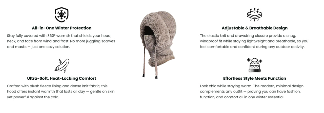 3) Embrace the Warmth: Step outside and feel the difference — cozy fleece, stylish knit, and 360° coverage that keeps you warm, confident, and winter-ready all day long.