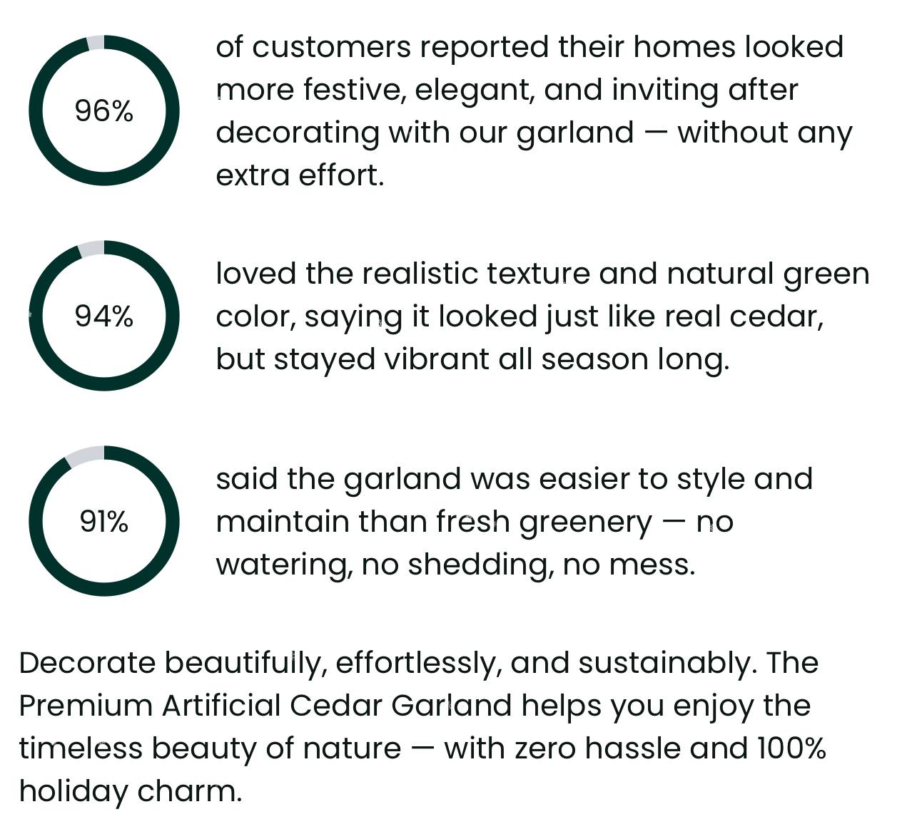 Our promise? Delivering the look and feel of real cedar greenery, with none of the hassle. The Premium Artificial Cedar Garland comes with a 30-day 100% satisfaction guarantee, ensuring your holiday decorating experience is worry-free and full of joy.